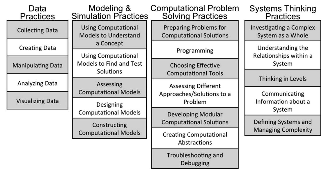 David Weintrop and colleagues provide one of the most useful tools for science teachers interested in integrating CT into their science classrooms, the Computational Thinking in Mathematics and Science Taxonomy. Through the development of their taxonomy, Weintrop and his team sought to move CT education away from an exclusive focus on programming and towards broad integration of a variety of CT skills across a number of disciplines (As envisioned in the Next Generation Science Standards). Their work provides one of the clearest articulations of the role of CT in science classrooms.